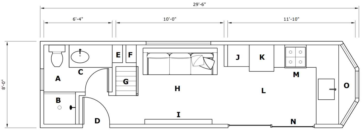 The Felicity is our original two-story tiny home with two bedrooms on the upper level with a walkway in between. The main level features a full bathroom with a bathtub or walk-in shower, a full kitchen with a bay window and a large pantry, and a stunning living room with a fireplace, vaulted ceilings.